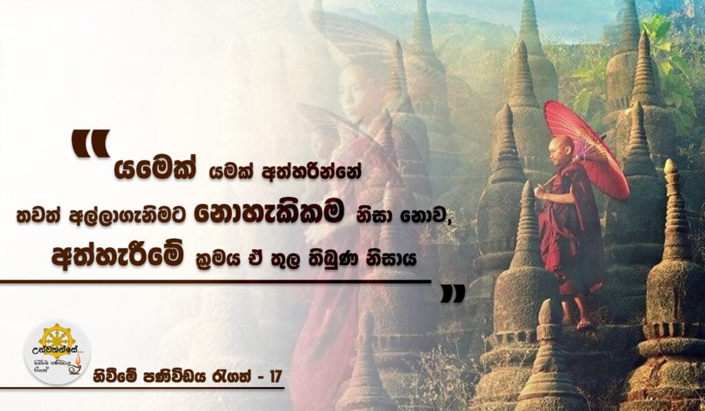 සෑම අල්ලාගැනීමකටම ක්රමයක් ඇත. එම අල්ලාගැනීම තුලම අත්හැරීමේ ක්රමයද ඇත. තමා අල්ලාගෙන සිටින දේවලද , අසුවී වී සිටින දේවලද අත්හරින ක්රමය හදුනාගෙන එයින් නිදහස් වීම පුරුදු කරන්න.